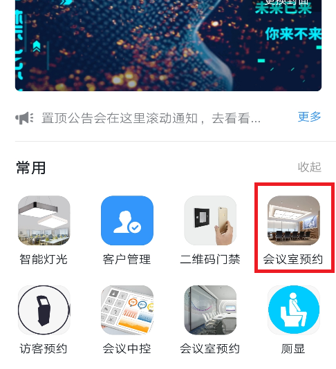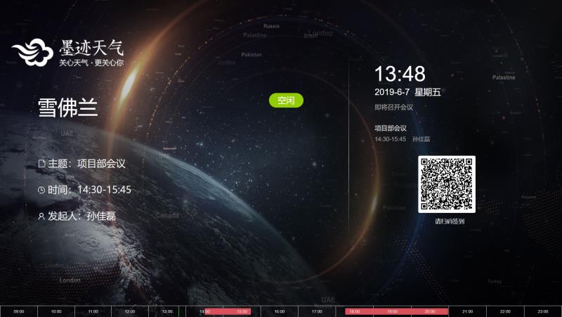 还可以看到在屏幕上显示了一个二维码,当您路过发现这个会议室是空着,而您正好需要一个会议预约时,就可以直接扫一扫这个二维码,实现一键预约。