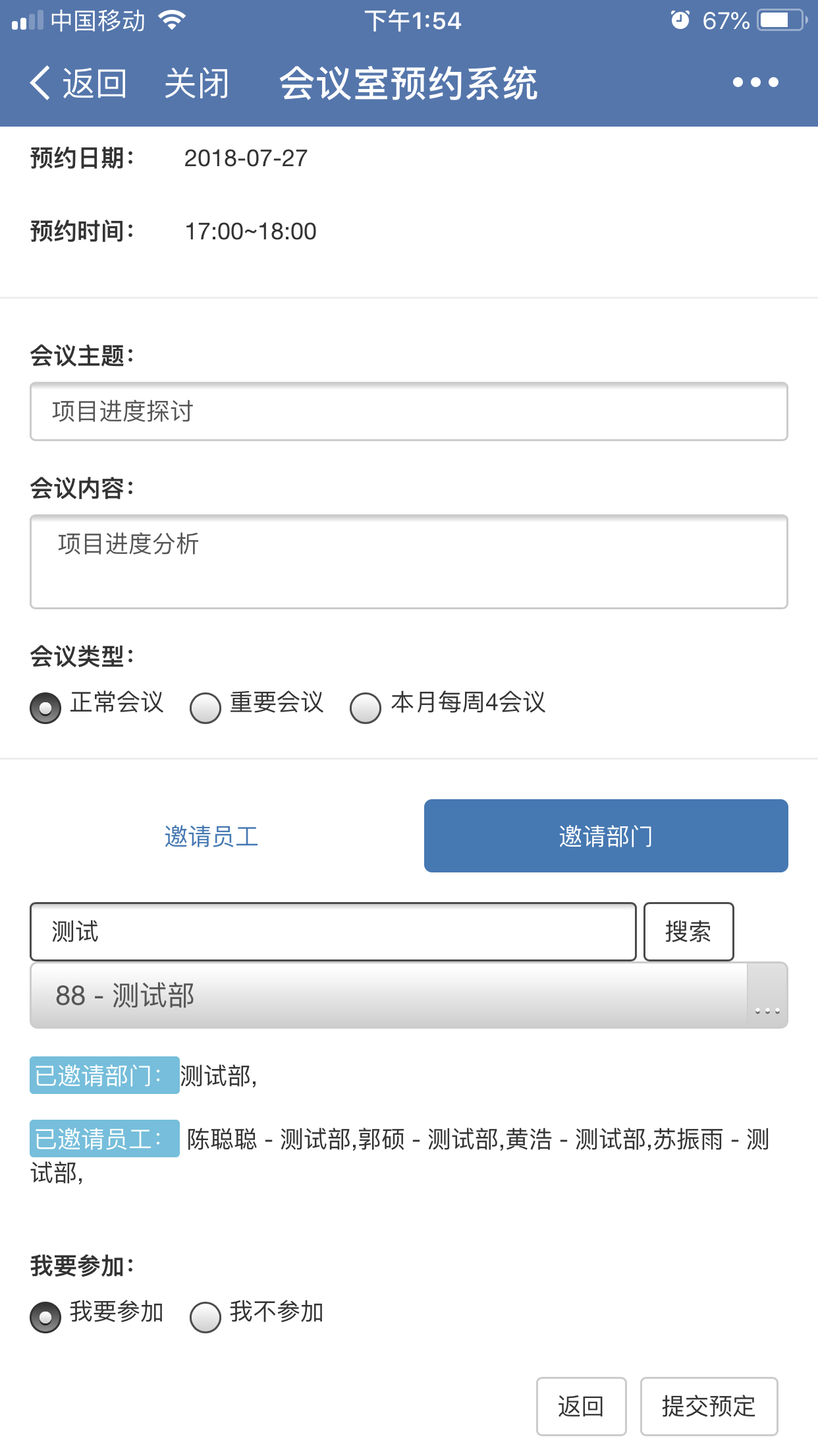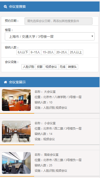 走进入口,当然就是系统的主体,我们将它简化浓缩到只有三步,是的,只有三步,一二三前后两分钟不到,就可以完成一次会议预约。