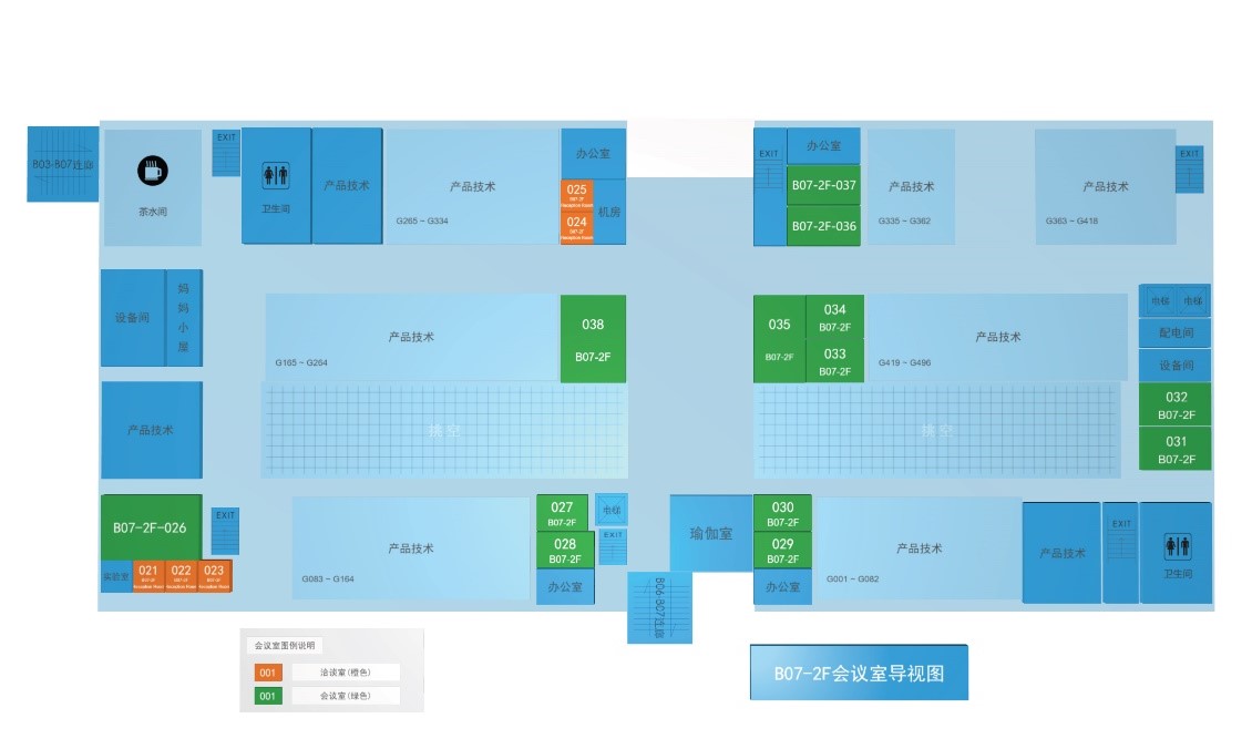 这个3D的会议室导视图,在手机APP里实时同步,会议室的使用情况,红色是已经预约或者正在使用,绿色是空闲可以预约,直观生动一目了然。