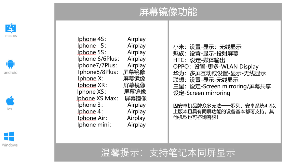 支持安卓/苹果/平板/笔记本电脑等大部分智能设备